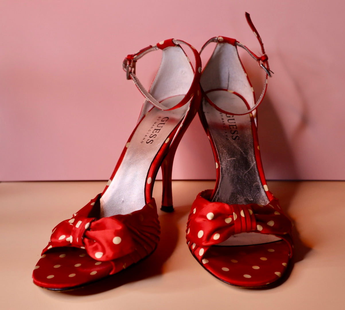 These flirty GUESS satin heels feature a bold red polka dot print, adorable bow accents, and a classic ankle strap for that ultimate retro glam. Perfect for adding a playful pop to summer dresses, swing skirts, or date night looks. Gently loved with wear on the insoles, but ready to keep turning heads!