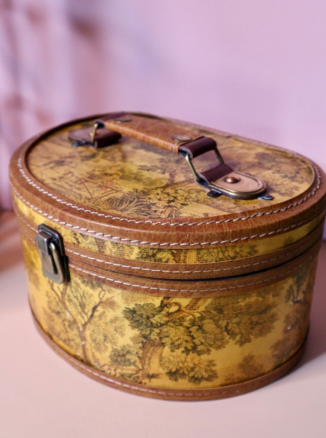 This 1960s–70s oval tapestry train case is perfect for storing hats, accessories, or cosmetics. Featuring a dreamy pastoral toile-inspired print, faux leather trim, sturdy top handle, and a plush burgundy interior. Functional metal latches add retro charm. Style it as unique home decor, use for storage, or carry it as a statement travel piece. Shows expected vintage wear — see photos for details.